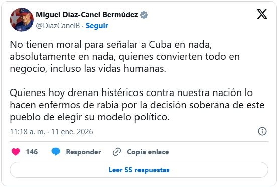 El presidente de Cuba, Miguel Díaz-Canel, declaró este domingo que «no tienen moral para señalar a Cuba en nada, absolutamente en nada, quienes lo convierten todo en negocio, incluso las vidas humanas». La declaración del mandatario cubano se produjo después de que el presidente de EE.UU., Donald Trump, afirmara que «no habrá más petróleo ni dinero para Cuba».