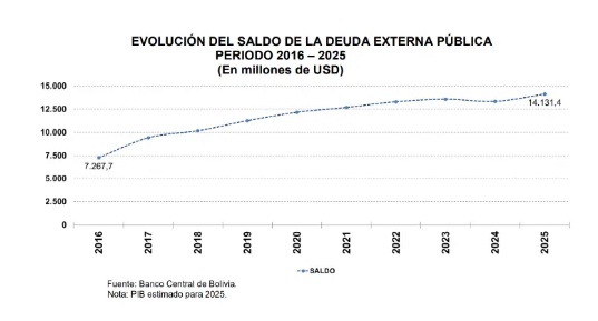 El saldo de la deuda externa pública alcanzó a $us 14.131 millones al 31 de diciembre de 2025, según el reporte del Banco Central de Bolivia (BCB) publicado en su página web.