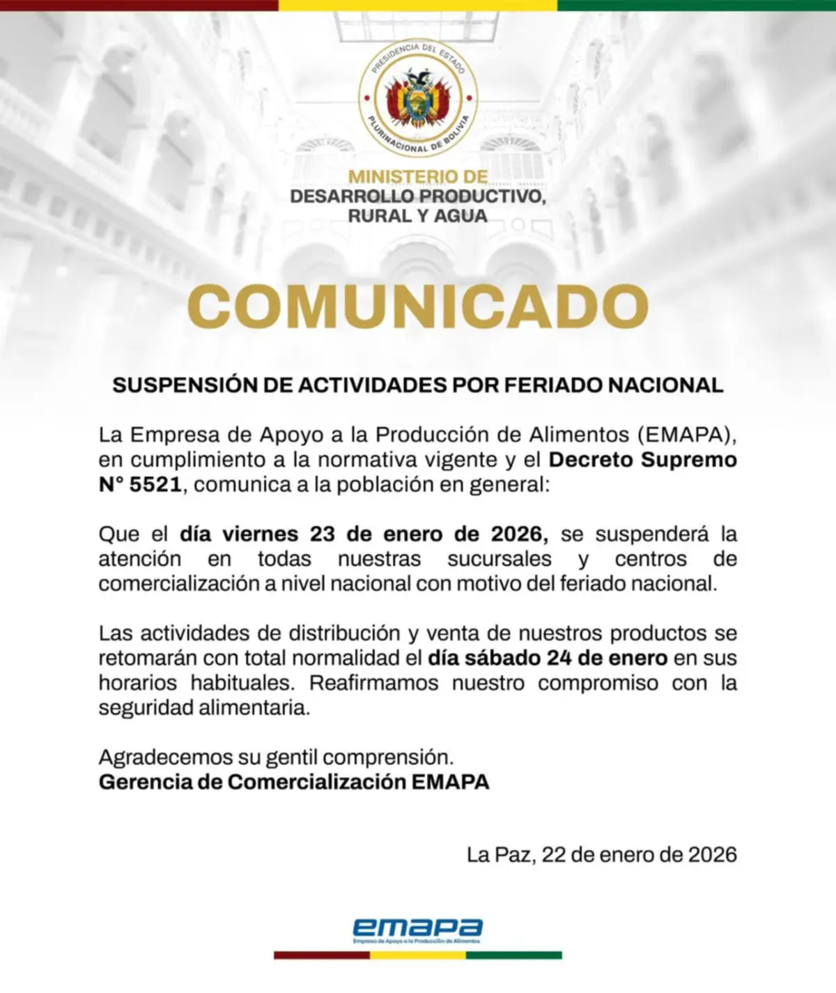 La Empresa de Apoyo a la Producción de Alimentos (EMAPA) publicó un comunicado desde la Gerencia de Comercialización para todos sus clientes que, por disposición del Decreto Supremo 5521 de Feriados Nacionales, este viernes 23 de enero suspende su atención al público en todas sus agencias a nivel nacional.