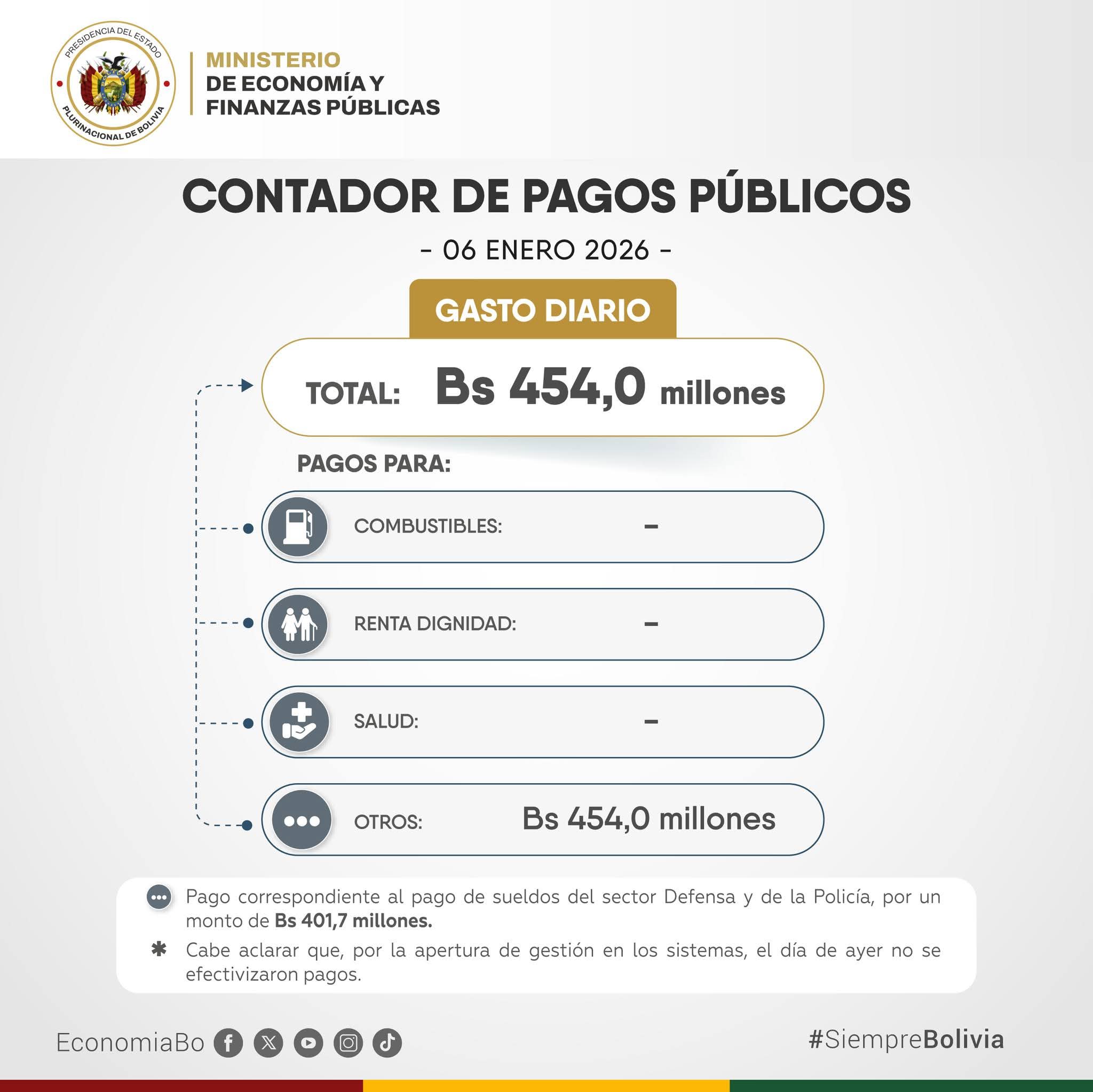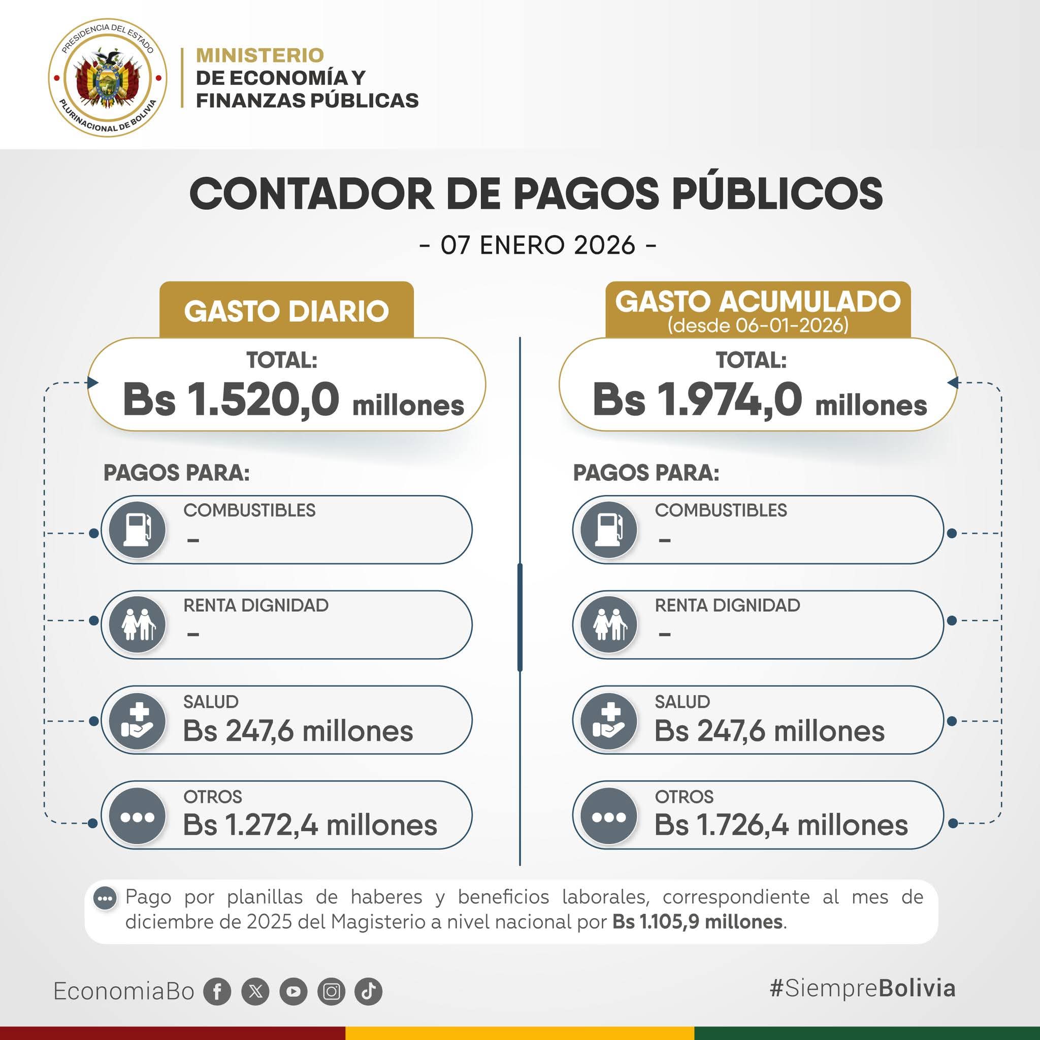 En tanto, el miércoles 8 de enero, el Ministerio reportó un gasto diario de Bs 1.520 millones, de los cuales Bs 247,6 millones fueron al sector salud y Bs 1.272,4 millones a “otros” donde se incluye “el pago por planillas de haberes y beneficios laborales correspondiente al mes de diciembre de 2025 del Magisterio a nivel nacional por Bs 1.105,9 millones”.