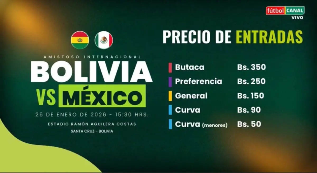 La Federación Boliviana de Fútbol anunció este lunes los precios de las entradas para el partido amistoso que disputará la selección boliviana ante México, este domingo, en el estadio Ramón Tahuichi Aguilera de Santa Cruz de la Sierra.