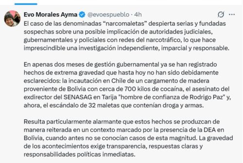 «El caso de las denominadas “narcomaletas” despierta serias y fundadas sospechas sobre una posible implicación de autoridades judiciales, gubernamentales y policiales con redes del narcotráfico, lo que hace imprescindible una investigación independiente, imparcial y responsable», agregó el exjefe del MAS.