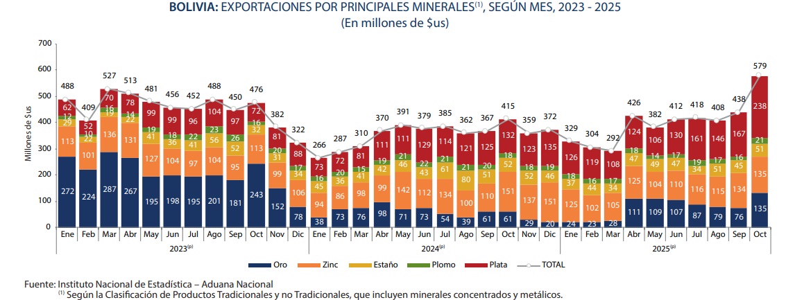 En octubre de 2025, las exportaciones de minerales sumaron $us 579 millones, el mayor pico alcanzado en un mes desde julio de 2022, revelan datos del Instituto Nacional de Estadística (INE).