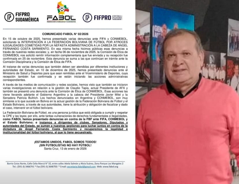 Finalmente, la entidad que agremia a los futbolistas recordó que la Federación Boliviana de Fútbol es una persona jurídica obligada a cumplir y respetar la Constitución Política del Estado y las leyes vigentes. Por ello, y ante las reiteradas vulneraciones de derechos e ilegalidades denunciadas, Fabol ratificó la presentación de denuncias formales ante la FIFA, la Conmebol y el Estado boliviano.