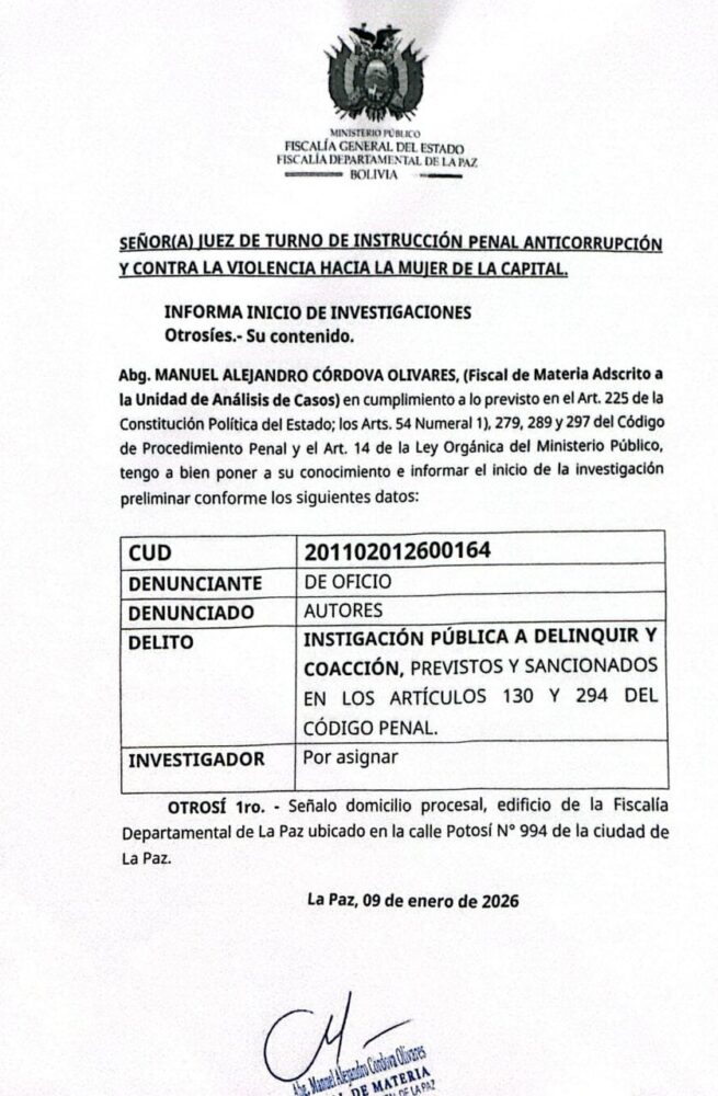 El fiscal departamental de La Paz, Carlos Torrez, informó que se abrió una investigación de oficio contra exdirigentes de la Federación de Trabajadores Campesinos Tupac Katari que amenazaron con saquear las comunidades que no acaten el paro y el bloqueo de caminos,  contra el Decreto Supremo 5503.