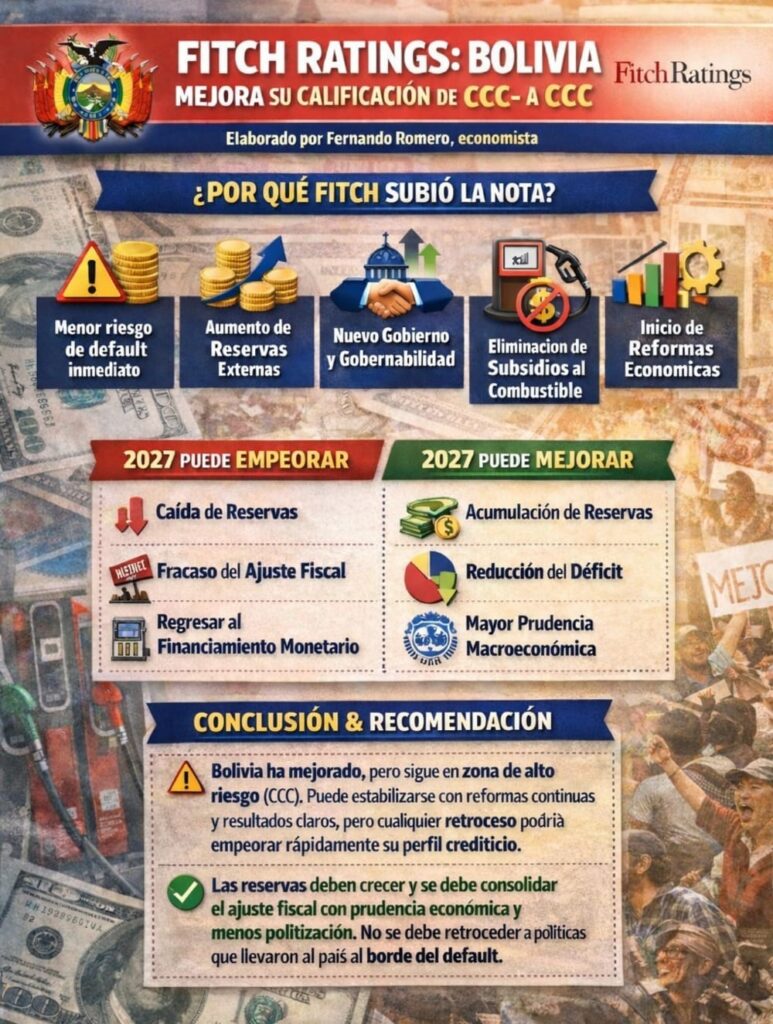“Bolivia sigue siendo riesgosa, pero ya no está al borde inmediato del abismo. Si el ajuste continúa y las reservas crecen, puede estabilizarse. Si no, el riesgo vuelve rápidamente y con mayor fortaleza”.