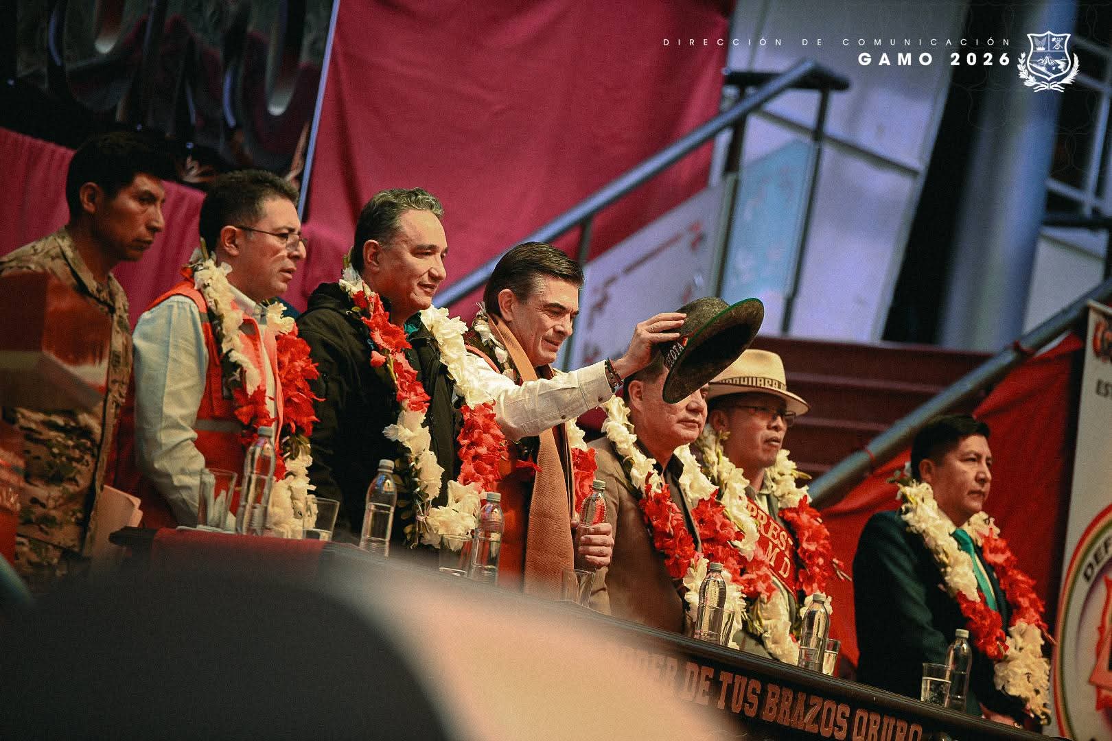 El presidente Rodrigo Paz y distintas autoridades en el acto en la Gobernación de Oruro. Foto: GAMO