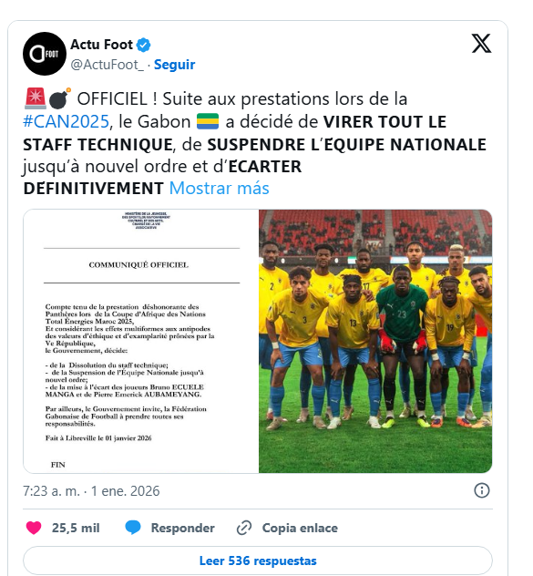 El Gobierno de Gabón anunció una serie de sanciones inéditas contra su selección nacional de fútbol luego de lo que calificó como una «actuación deshonrosa» en la Copa Africana de Naciones (CAN 2025). La decisión fue comunicada oficialmente por el Ministerio de Juventud y Deportes y leída en la televisión pública el 1 de enero, reportó el medio local Info241.