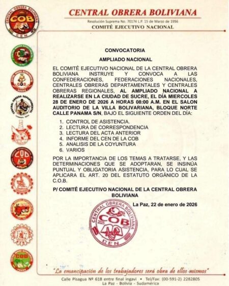 De acuerdo con la convocatoria oficial, el encuentro se realizará desde las 08:00 en el auditorio de la Villa Bolivariana y reunirá a confederaciones, federaciones nacionales, centrales obreras departamentales y regionales, con el objetivo de analizar la coyuntura política y social, además de recibir el informe del Comité Ejecutivo Nacional de la COB.