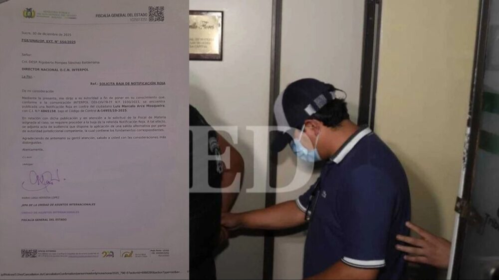 La Unidad de Asuntos Internacionales de la Fiscalía General del Estado solicitó a Interpol la baja de la notificación roja emitida contra Luis Marcelo Arce Mosqueira, hijo del expresidente Luis Arce Catacora, luego del cierre del proceso por violencia familiar que se tramitó en su contra y concluyó en octubre de 2025.