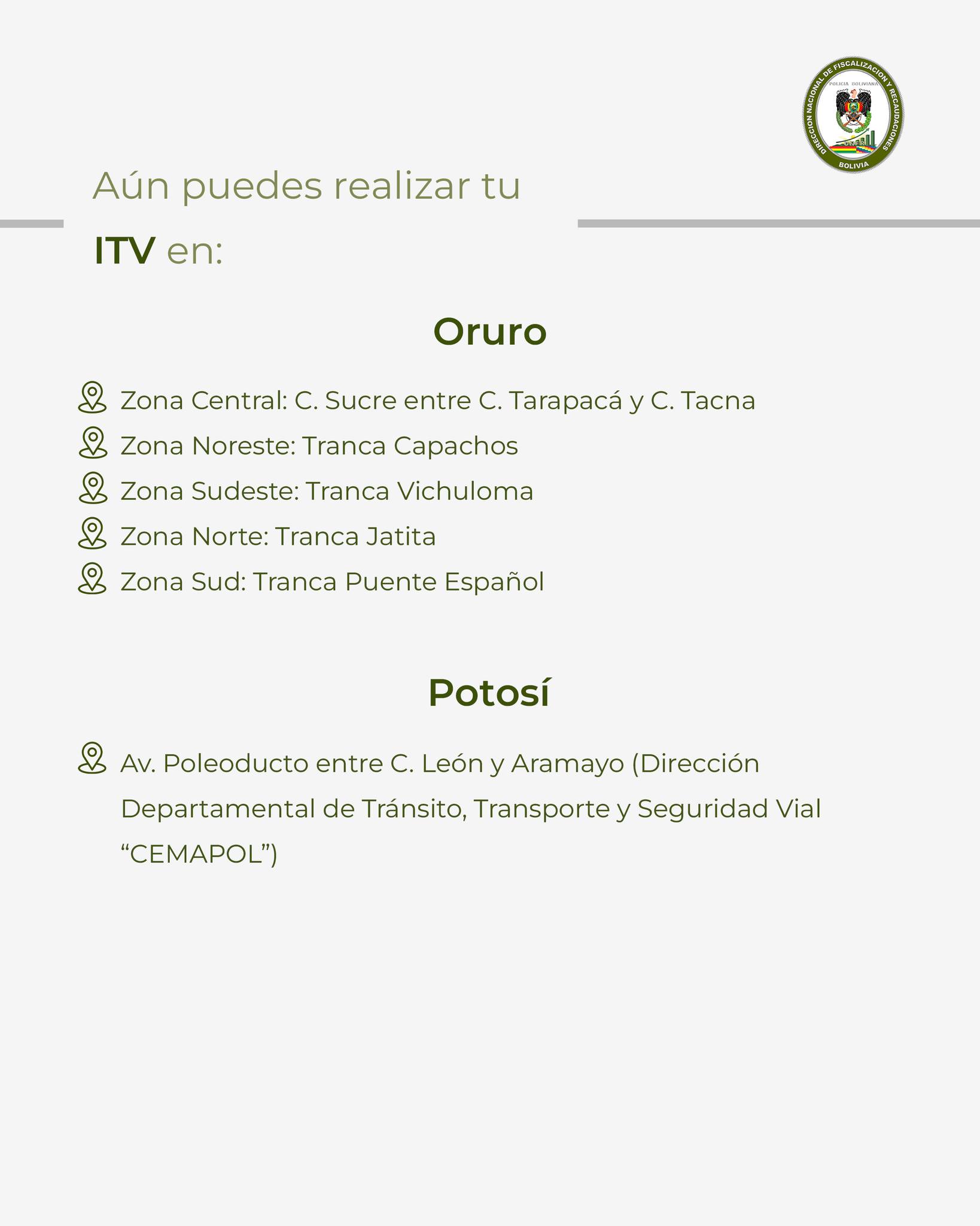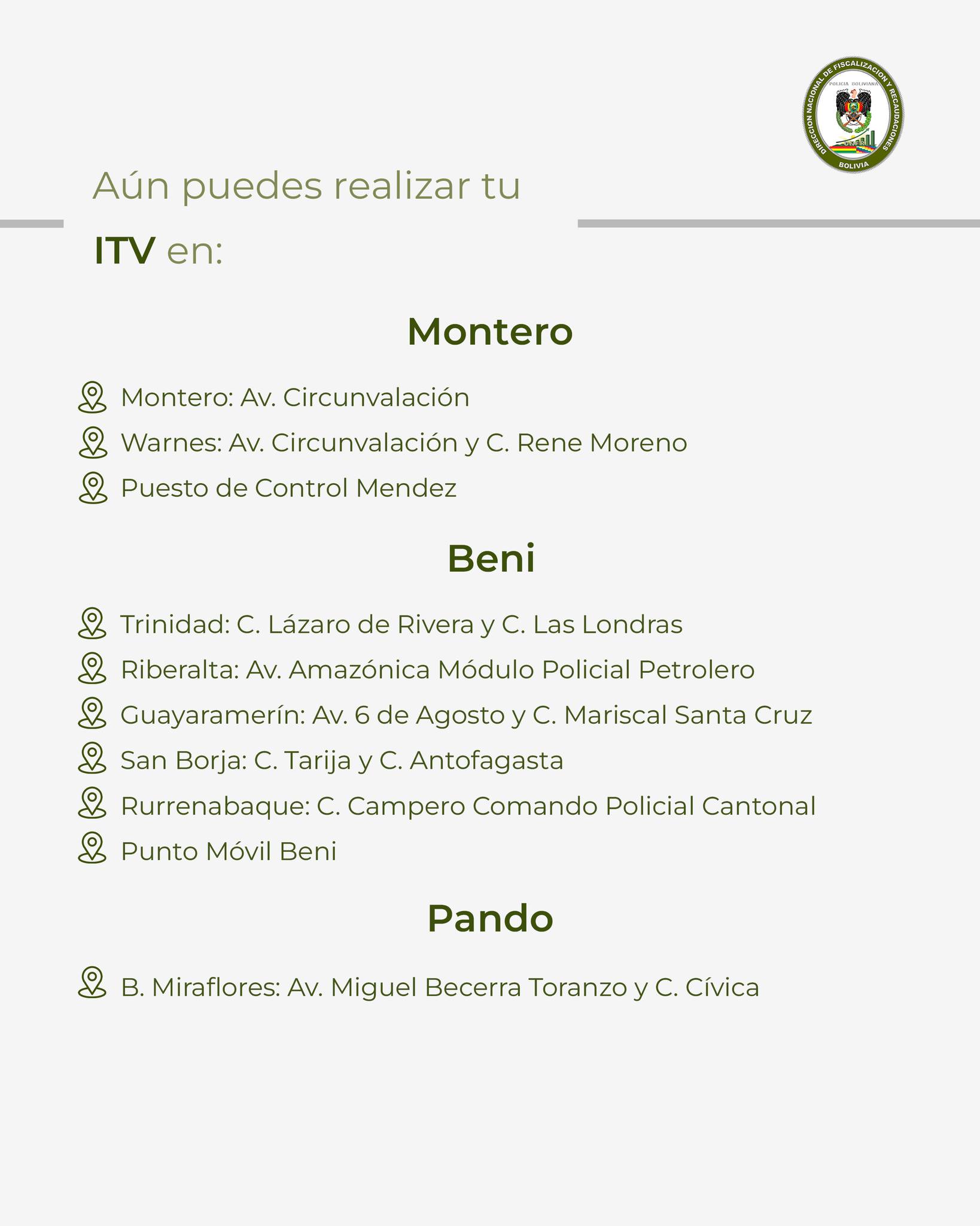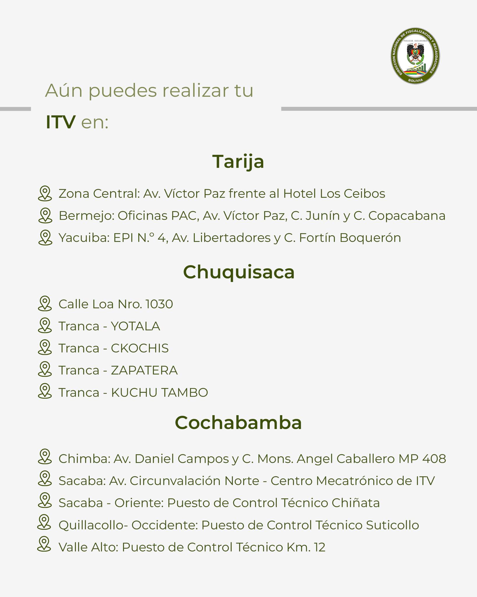 «La Dirección Nacional de Fiscalización y Recaudaciones informa a la ciudadanía que, concluido el plazo oficial de la Inspección Técnica Vehicular 2025, se han habilitado de manera excepcional algunos puntos de atención para las y los propietarios de vehículos que no realizaron la ITV dentro del período establecido», se lee en una publicación de esa repartición.