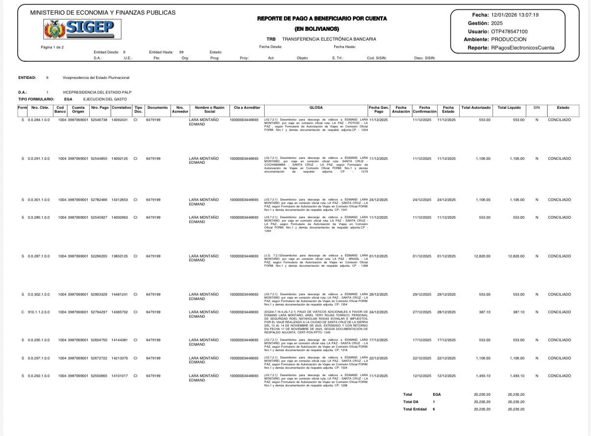 Lara ingresó a la función pública el 8 de noviembre de 2025, por lo que recibirá un sueldo casi íntegro por ese mes trabajado, y otro salario correspondiente a diciembre, eso sin contar con los más de 20.000 bolivianos que ya cobró por los viáticos de sus viajes.