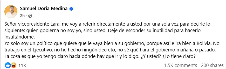 El vicepresidente Edmand Lara y el empresario Samuel Doria Medina sostuvieron un tenso cruce de declaraciones en redes sociales. El segundo funcionario del Estado señaló que el líder de Unidad Nacional da mala suerte al Gobierno, mientras el empresario le dijo a Lara que “quien gobierna no soy yo, sino usted”.