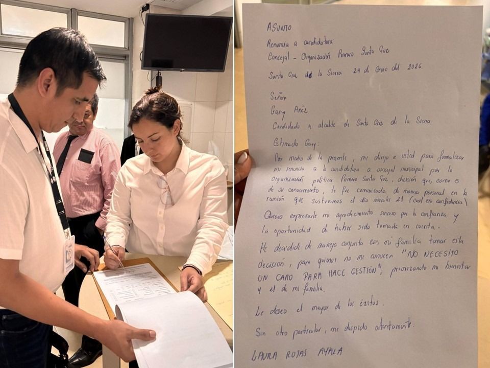 “Me dirijo a usted para formalizar mi renuncia a la candidatura a concejal municipal por la organización política Primero Santa Cruz, decisión que, como es de su conocimiento, le fue comunicada de manera personal en la reunión que sostuvimos el día 21 de enero”, reza la carta remitida a Gary Añez.