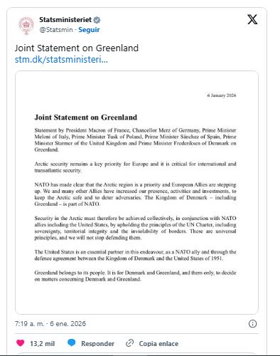 «El Reino de Dinamarca -incluida Groenlandia- forma parte de la OTAN. Por lo tanto, la seguridad en el Ártico debe garantizarse de manera colectiva, en cooperación con los aliados de la OTAN, incluidos Estados Unidos», añadieron los líderes en una declaración publicada, entre otros, por el gobierno alemán.