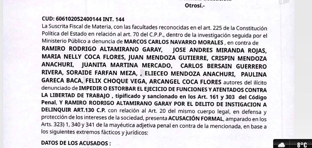 En su acusación, el Ministerio Público no solo pide la sentencia de los 12 comunarios, sino que paguen “las costas procesales al Estado” y el “resarcimiento al daño civil causado” a la petrolera.