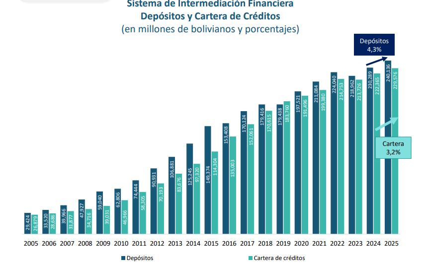 De acuerdo con el reporte, los depósitos subieron de Bs 230.289 millones en 2024 a Bs 240.136 millones en la gestión pasada. Mientras que, en el caso de la cartera de créditos, se incrementó de Bs 222.365 millones en 2024 a Bs 229.576 millones en 2025.