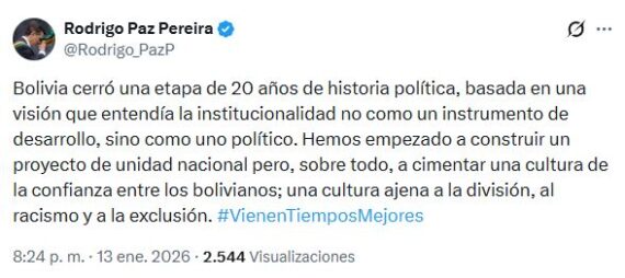 El presidente Rodrigo Paz hizo hoy (13) una declaración en sus redes sociales y afirmó que Bolivia ha cerrado definitivamente una etapa de dos décadas de historia política caracterizada por una visión que instrumentalizó las instituciones del Estado para fines políticos en lugar de utilizarlas como herramientas para el desarrollo. El mandatario planteó que el país ha iniciado la construcción de un nuevo proyecto nacional basado en la unidad y la confianza.