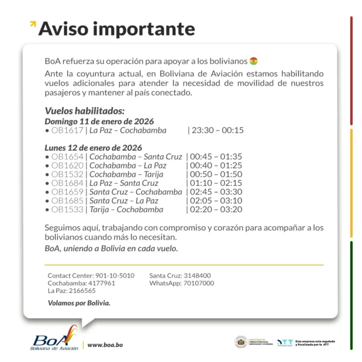 Boliviana de Aviación (BoA) habilitó vuelos adicionales este domingo 11 y lunes 12 de enero para facilitar la movilidad de pasajeros afectados por los bloqueos de carreteras en distintas rutas del país.