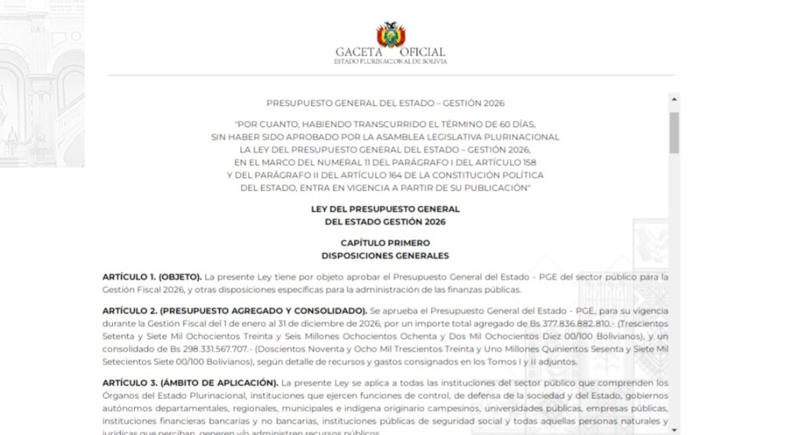“Por cuanto, habiendo transcurrido el término de 60 días, sin haber sido aprobado por la Asamblea Legislativa Plurinacional le ley del Presupuesto General del Estado-Gestión 2026, en el marco del numeral 11 del parágrafo I del artículo 158 y del parágrafo II del artículo 164 de la Constitución Política del Estado, entra en vigencia a partir de su publicación”, establece el encabezado de la norma publicada en la Gaceta Oficial.