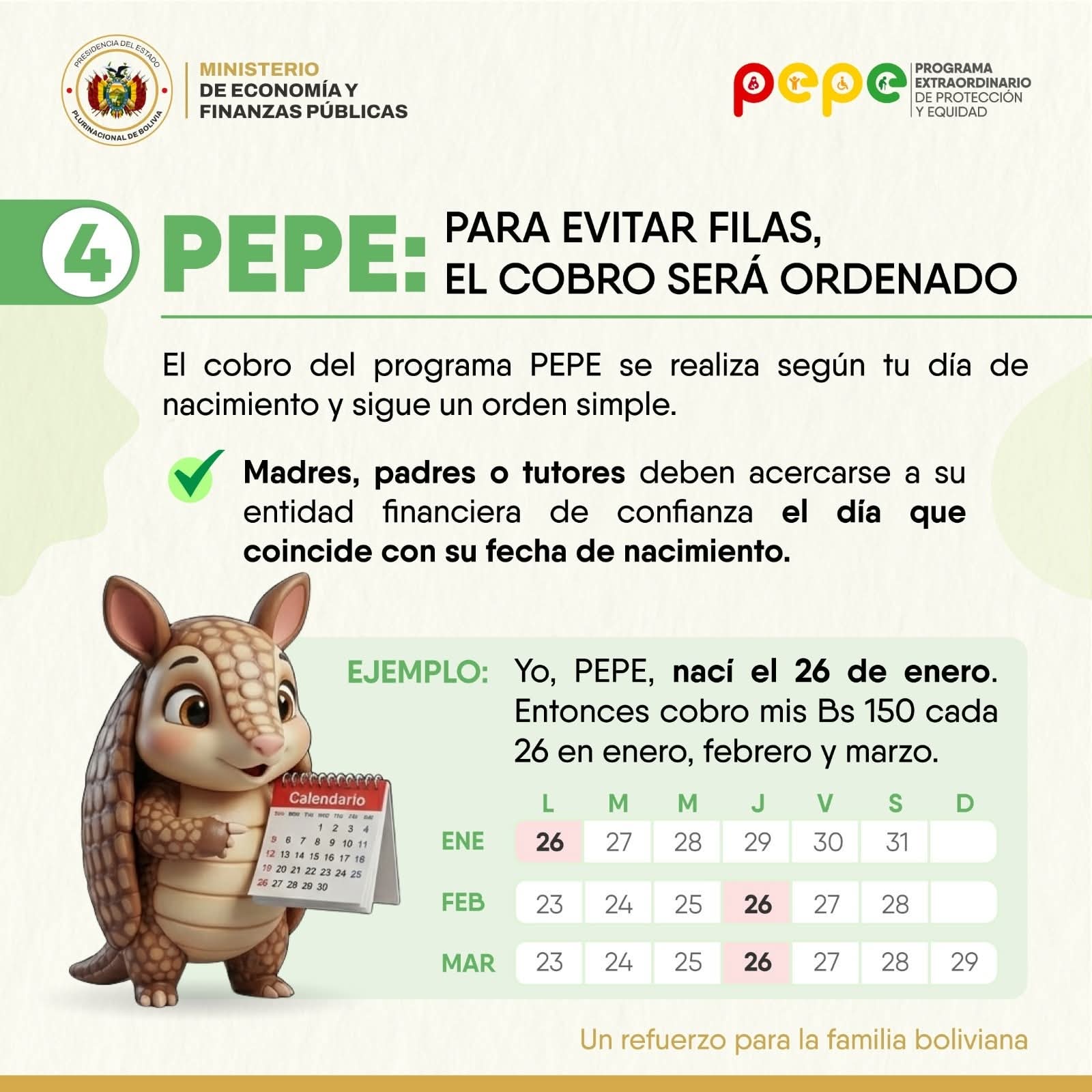 * Las y los beneficiarios podrán cobrar el PEPE en la entidad financiera más próxima a su domicilio, de acuerdo con el día de su fecha de nacimiento, debiendo presentar su Cédula de Identidad original, acompañada de una fotocopia de la misma.