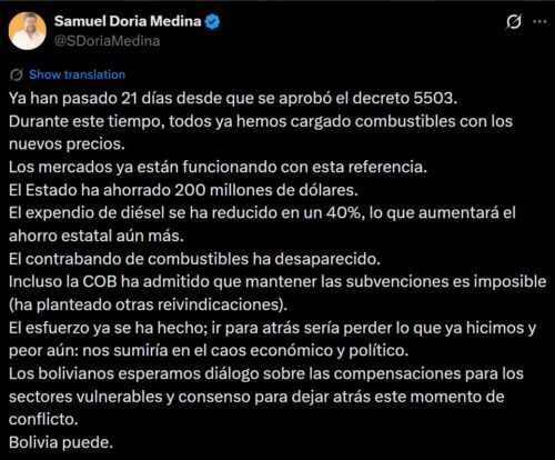 La Central Obrera Boliviana (COB) y otros sectores organizan marchas y bloqueos en rechazo al decreto de ajuste, pero se resisten a acudir a las mesas de diálogo convocadas por el Gobierno. En consecuencia, Doria Medina considera que dar marcha atrás con el DS 5503 sólo sumiría a Bolivia en la crisis.