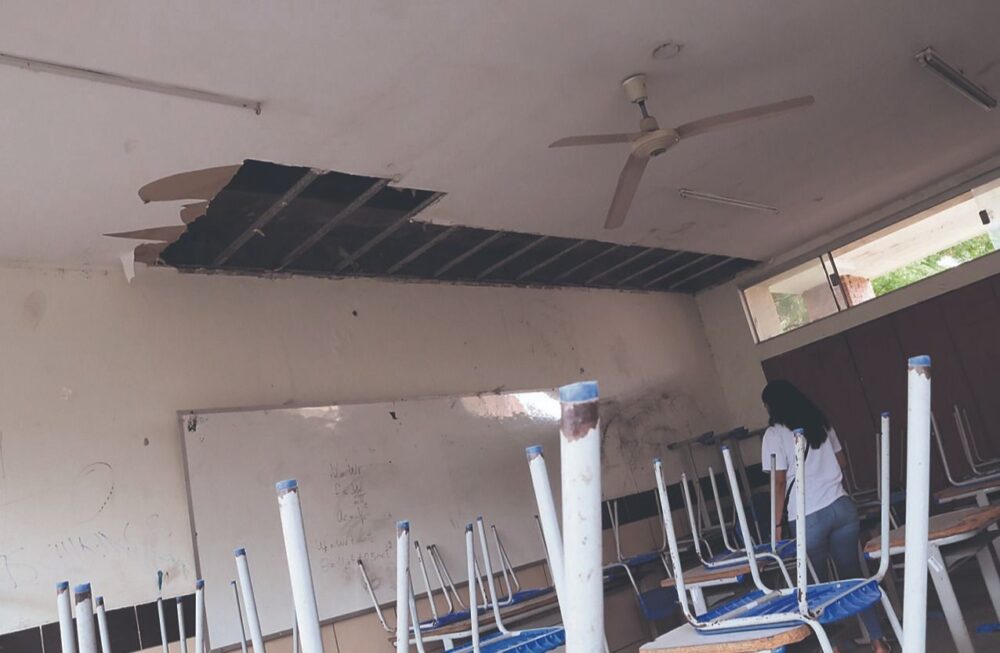 Al ingreso se observan grandes montículos de basura y, al recorrer las aulas, la falta de mantenimiento es evidente, en una de ellas hay un enorme hueco en el tumbado que cedió por las lluvias y no fue reparado. A esto se suman ventiladores a punto de desprenderse, mesas desgastadas y sillas rotas.