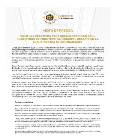 “Bolivia tiene casi 7 mil kilómetros de frontera que deben ser protegidos y controlados”, explicó la autoridad, al precisar que “el 52% corresponde a frontera seca y el 48% a frontera fluvial, lo que complejiza aún más las tareas de control”.