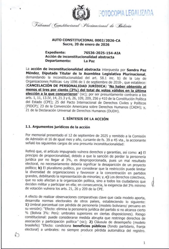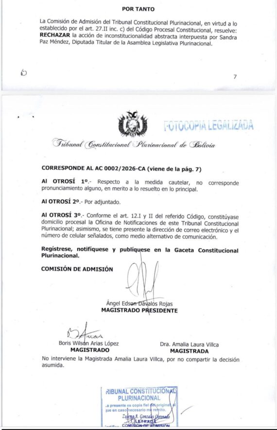 En el Auto Constitucional 0002/2026-CA, emitido el 20 de enero de 2026, la Comisión de Admisión del TCP resolvió: «RECHAZAR la acción de inconstitucionalidad abstracta interpuesta por Sandra Paz Méndez, Diputada Titular de la Asamblea Legislativa Plurinacional».