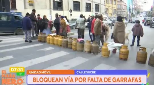 Vecinos de la zona central de La Paz bloquearon este miércoles la calle Sucre con garrafas, en protesta por la falta de Gas Licuado de Petróleo (GLP) y para exigir el abastecimiento regular.
