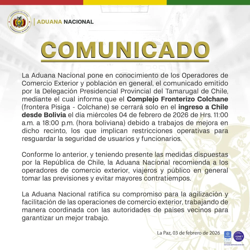 La Aduana Nacional informó a los operadores de comercio exterior, viajeros y a la población en general que el Complejo Fronterizo Colchane, en la frontera por Pisiga, cerrará temporalmente el ingreso a Chile desde Bolivia de 11.00 a las 18.00 (hora boliviana) de este miércoles 4.