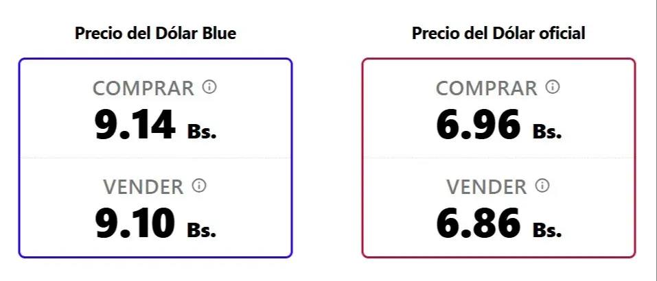 Por otro lado, el monitor en tiempo real bolivianblue.net, que actualiza sus valores cada 15 minutos, reporta cifras similares pero con una brecha más ajustada para la venta. Así, cotiza este domingo a la compra en 9.14 Bs y 9.10 Bs para la venta.
