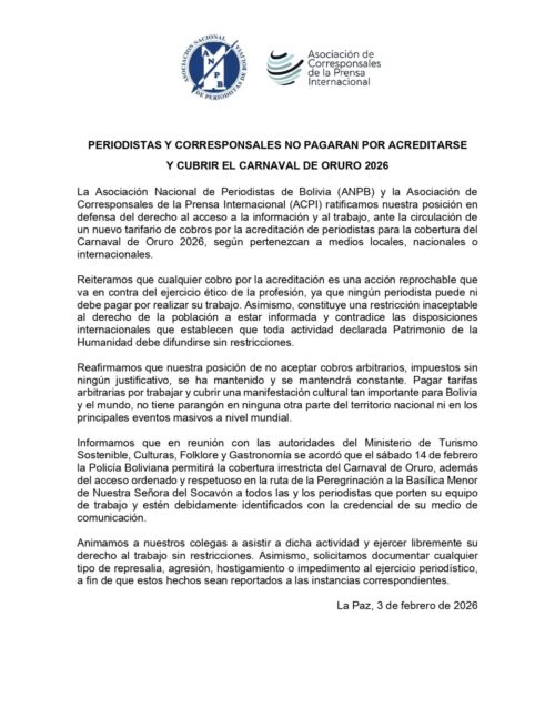«Ratificamos nuestra posición en defensa del derecho al acceso a la información y al trabajo, ante la circulación de un nuevo tarifario de cobros por la acreditación de periodistas para la cobertura del Carnaval de Oruro 2026, según pertenezcan a medios locales, nacionales o internacionales.