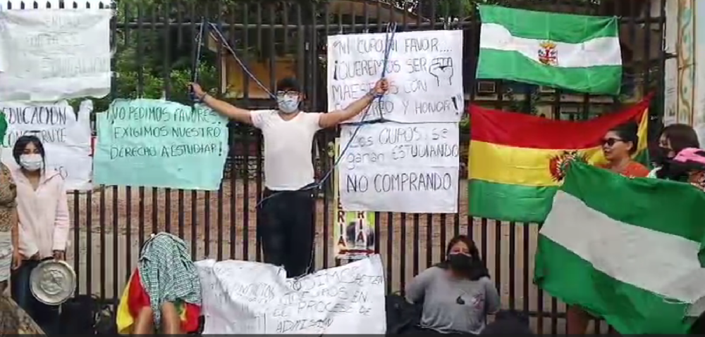 «(…) no fueron suficientes los cupos, ya que hubo 140 cupos para más de 5.500 postulantes en Santa Cruz. Nosotros pedimos la habilitación de todos nosotros, ya que contamos con la nota aprobatoria y tomamos estas medidas ya que no somos escuchados ni siquiera por la ministra (de Educación)», reclamó uno de los manifestantes.