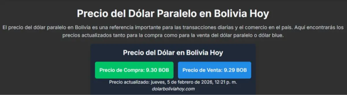 La cotización del dólar estadounidense en el mercado paralelo mostró a las 12:21 de este jueves 5 de febrero una ligera baja, tras el anuncio del Gobierno del presidente Rodrigo Paz sobre la devolución de divisas.