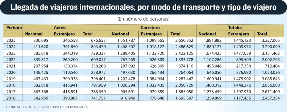 El flujo de viajeros desde el exterior (extranjeros y nacionales) que ingresan al país aumentó significativamente. Según datos del Instituto Nacional de Estadísticas (INE), el 2025 marca un récord en los últimos cinco años.