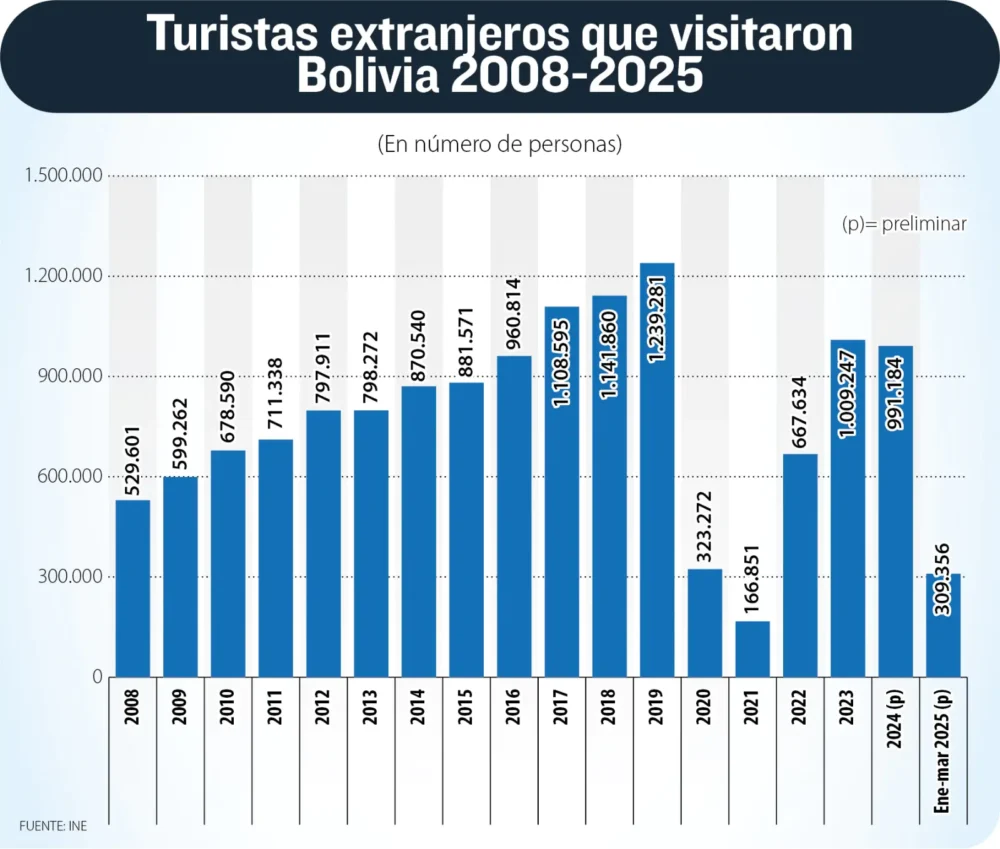 De hecho, en 2024 ingresó un 1,8% menos de turistas extranjeros con relación a la cifra del año anterior, según el INE. En aquel entonces, el anterior Gobierno de Luis Arce lo atribuía a los conflictos sociales promovidos por el exmandatario Evo Morales.