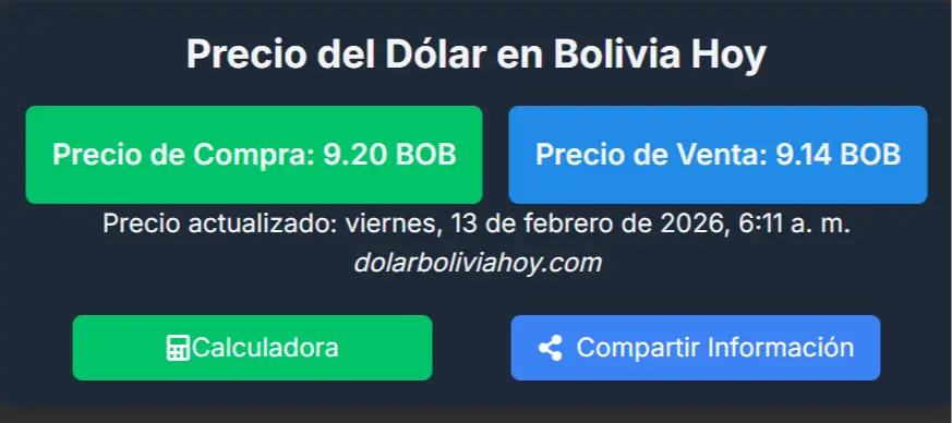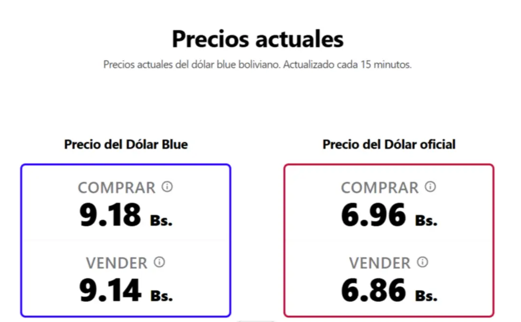 Por su parte, el sitio bolivianblue.net, que actualiza sus cifras cada 15 minutos, reporta Bs 9,18 para la compra y Bs 9,14 para la venta. La noche anterior había cerrado en Bs 9,22 y Bs 9,20.