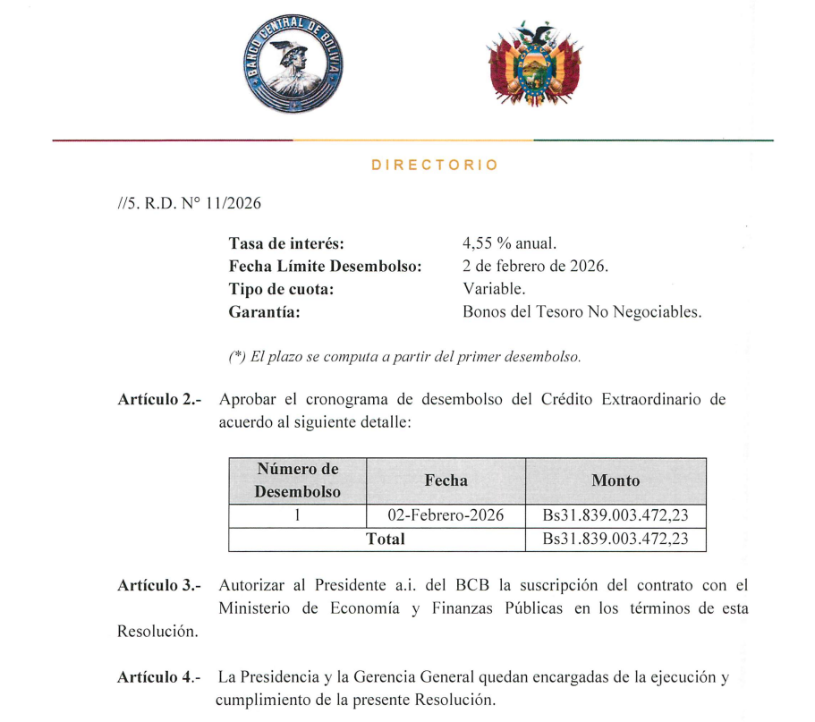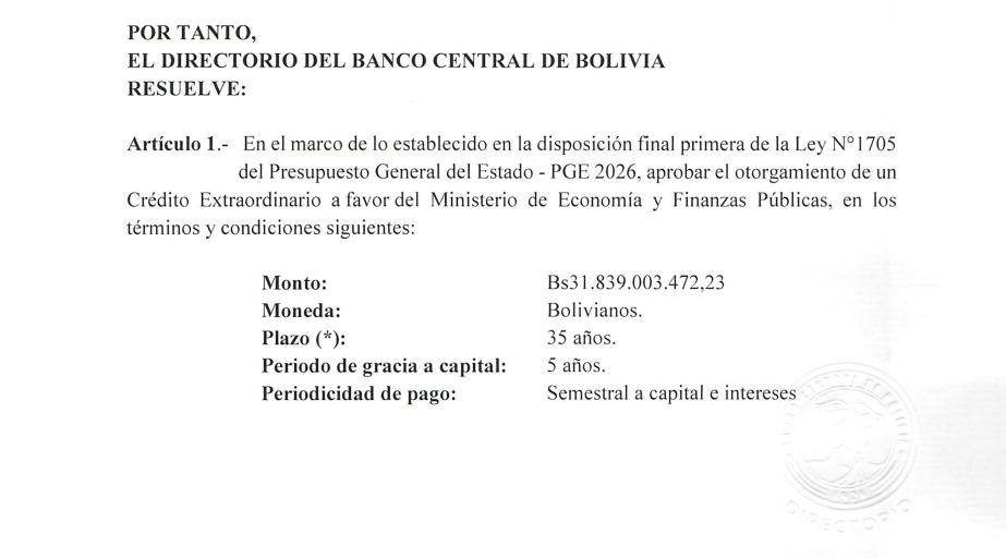 El préstamo está contemplado en la resolución del directorio N°11/2026, del 27 de enero de 2026, en el marco de la Ley 1705 del Presupuesto General del Estado 2026.