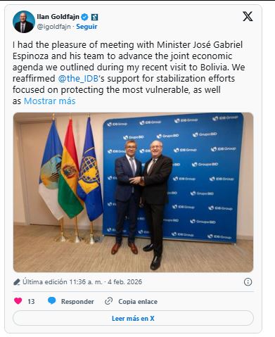 La declaración subraya la continuidad del diálogo entre Bolivia y el BID en materia económica, tomando en cuenta que, en enero, Ilan Goldfajn visitó Bolivia para reunirse con autoridades nacionales y revisar la agenda de cooperación económica del país.