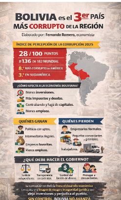 La corrupción en Bolivia no es un problema moral, es un problema económico, institucional y de desarrollo. Mientras siga siendo rentable y sin castigo, seguirá drenando recursos, destruyendo confianza y bloqueando el crecimiento. El CPI 2025 confirma que el país está atrapado en un equilibrio de baja integridad.