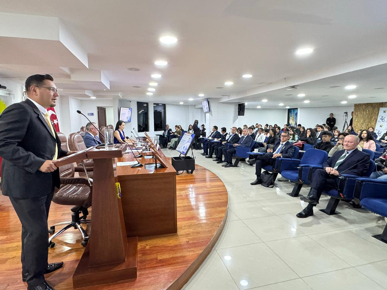 En Bogotá – Colombia, los Representantes de Bolivia ante Organismos Parlamentarios Supraestatales, a la cabeza del presidente del Parlamento Andino, Msc. DAEN René Daniel Camacho, participaron del “Lanzamiento de la Escuela Andina de Debate”, espacio regional de formación democrática orientado a consolidar una nueva generación de líderes con visión de integración andina.