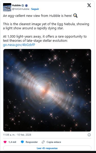 «La compacta Nebulosa del Huevo se halla todavía en una breve fase de tránsito —la etapa preplanetaria— que dura apenas unos pocos miles de años. Eso la convierte en un momento ideal para estudiar el proceso de eyección mientras las pruebas forenses siguen frescas», señala la institución.