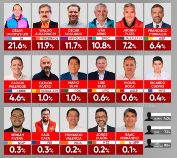Mientras tanto, Miguel Roca tiene el 0,6 % de la preferencia electoral; Ricardo Cuevas el 0,4 %; Hernán Rivera el 0,3 %; Raúl Daza el 0,3 %; Fernando Valencia el 0,2 %; Jorge Dulón el 0,2 % e Isaac Fernández el 0,1 %.