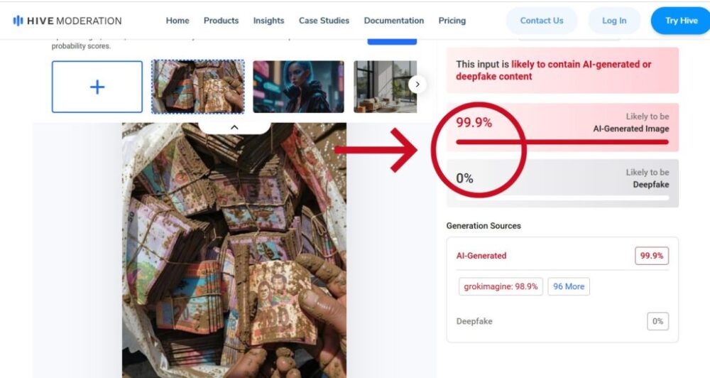 “Estas imágenes de billetes no corresponden al accidente aéreo de la FAB. La herramienta Hive Moderation detectó un 99 % de probabilidad de uso de inteligencia artificial. Además, la imagen original utilizada para generar el contenido falso fue publicada por el Banco Central de Bolivia en 2019”, indica a través de sus redes sociales.