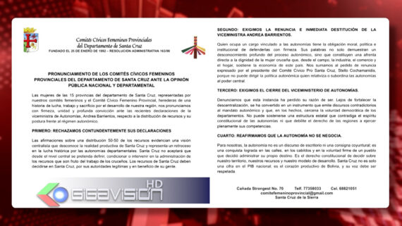 El segundo punto del pronunciamiento exige la renuncia e inmediata destitución de la viceministra Andrea Barrientos. Las cívicas argumentan que quien ocupa un cargo vinculado a las autonomías tiene la obligación moral, política e institucional de defenderlas con firmeza y consideran que sus palabras «no solo demuestran un desconocimiento profundo del proceso autónomo, sino que constituyen una afrenta directa a la dignidad de la mujer cruceña que, desde el campo, la industria, el comercio y el hogar, sostiene la economía de este país». Las organizaciones se sumaron así al pedido de renuncia ya expresado ayer por el presidente del Comité Cívico Pro Santa Cruz, Stello Cochamanidis.