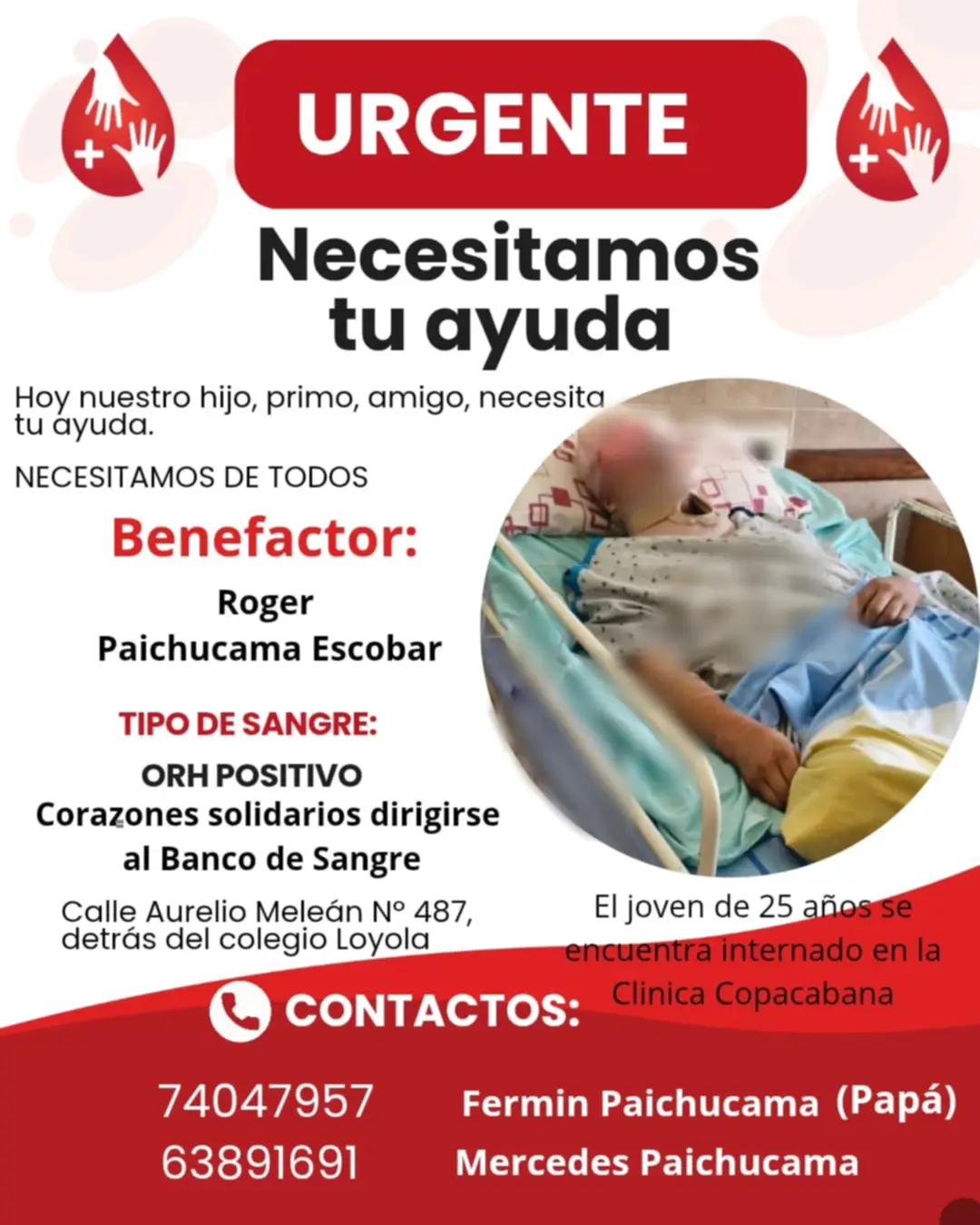 Mientras el joven lucha por recuperarse, su familia solicita con urgencia donadores de sangre tipo O Rh positivo. Las personas que deseen colaborar pueden comunicarse con Mercedes Paichucama al 63891691.