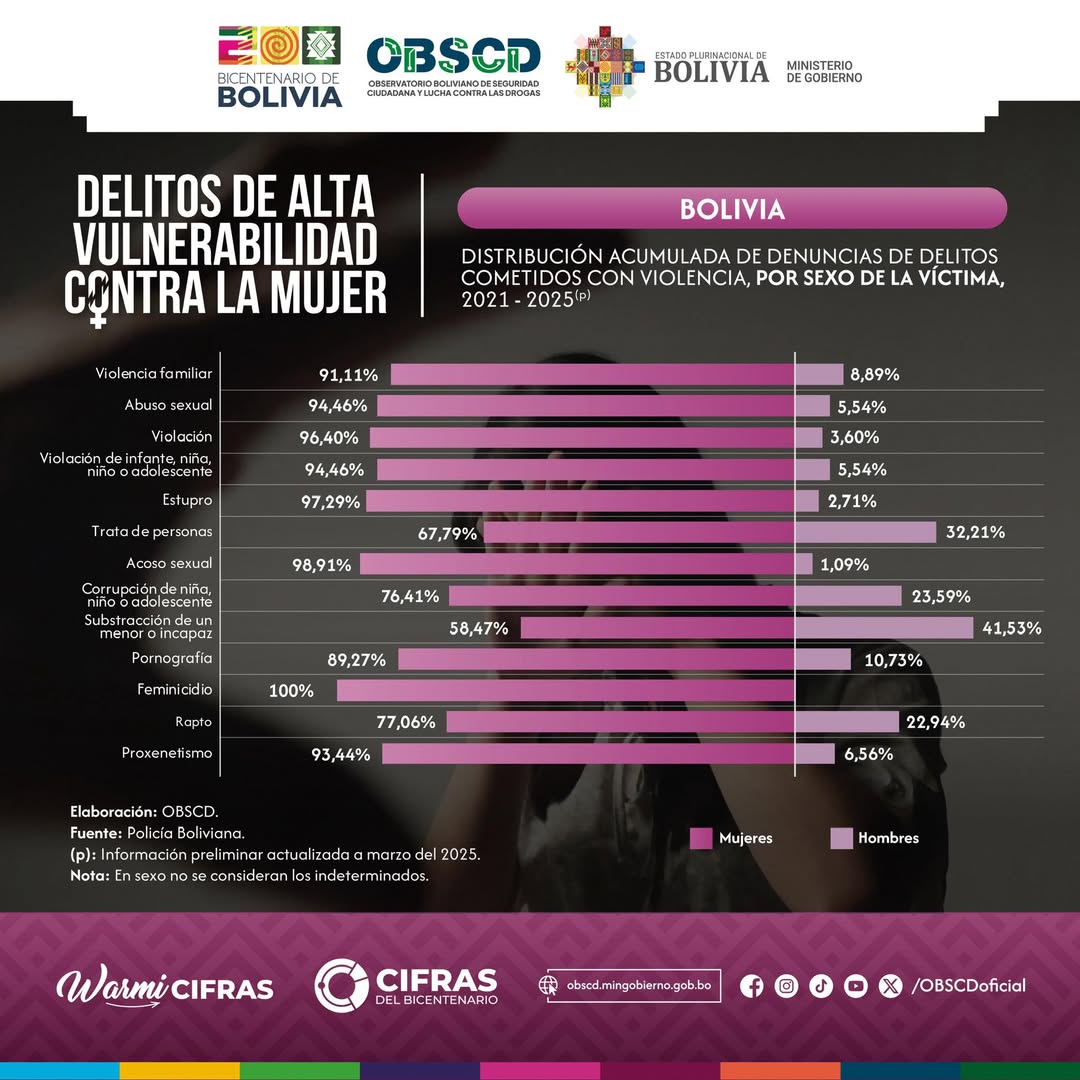 Según datos oficiales disponibles, Bolivia continúa enfrentando desafíos significativos en materia de delitos sexualizados. Entre enero y septiembre de 2025, el Observatorio Boliviano de Seguridad Ciudadana y Lucha contra las Drogas (OBSCD) registró 1.461 denuncias de abuso sexual a menores de 13 años o menos, las cifras acumuladas del mismo año muestran miles de casos de violencia de género y sexual denunciados ante las autoridades competentes del país.