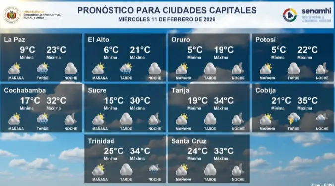 El Servicio Nacional de Meteorología e Hidrología (Senamhi) informó que este miércoles 11 de febrero se prevé un clima estable en el país, con nubosidad y baja probabilidad de lluvias en algunas regiones del oriente boliviano.