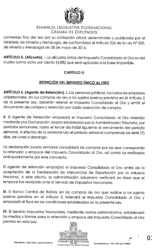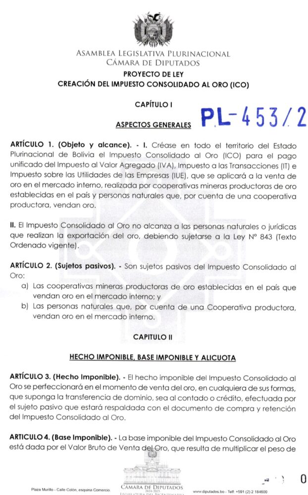 La propuesta fue presentada en la anterior legislatura y repuesta este año a solicitud de la diputada del PDC, Danitza Mejía. La norma se aplicaría a las cooperativas mineras y personas naturales que vendan oro en el mercado boliviano.